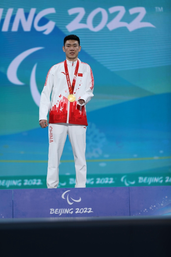 颁奖仪式上,冬残奥冠军梁景怡拍了拍胸前的五星红旗