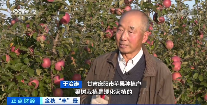 甘肃庆阳市苹果种植户 于治涛:现在发展的是现代农业,果树栽植是矮化密植的,从管理到采摘都比较方便,我种植了15亩果园,预计今年产量是22吨,今年苹果价格比往年每斤高1元,纯利润达7万元、8万元,效益非常不错。